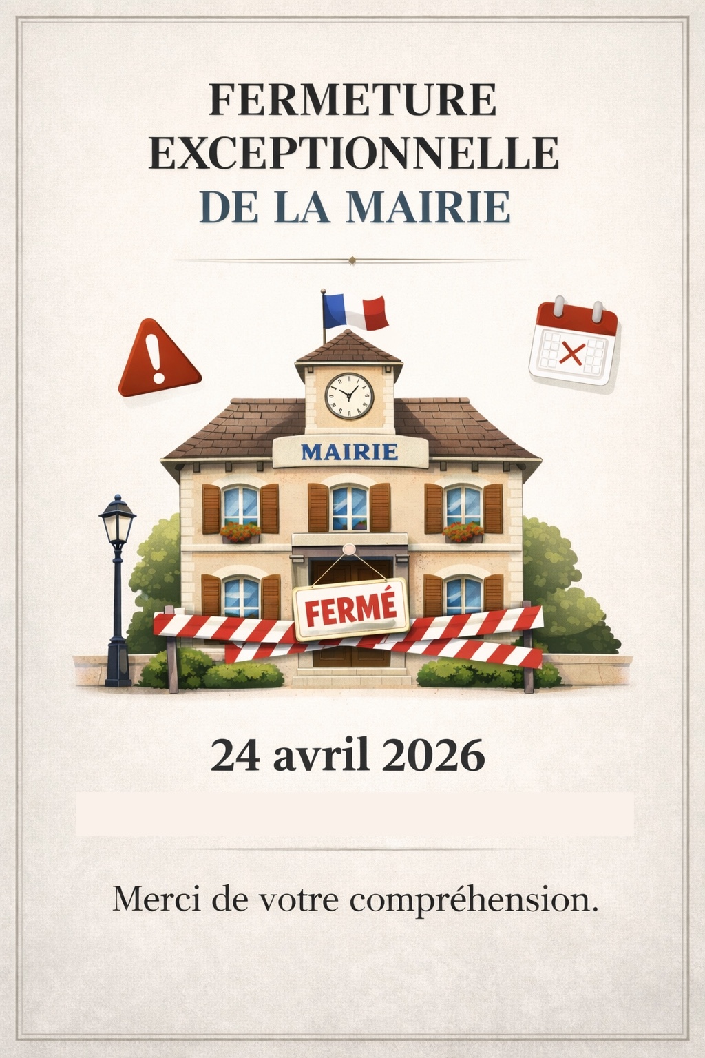 Vous êtes ici : Accueil > Fermeture exceptionnelle de la mairie